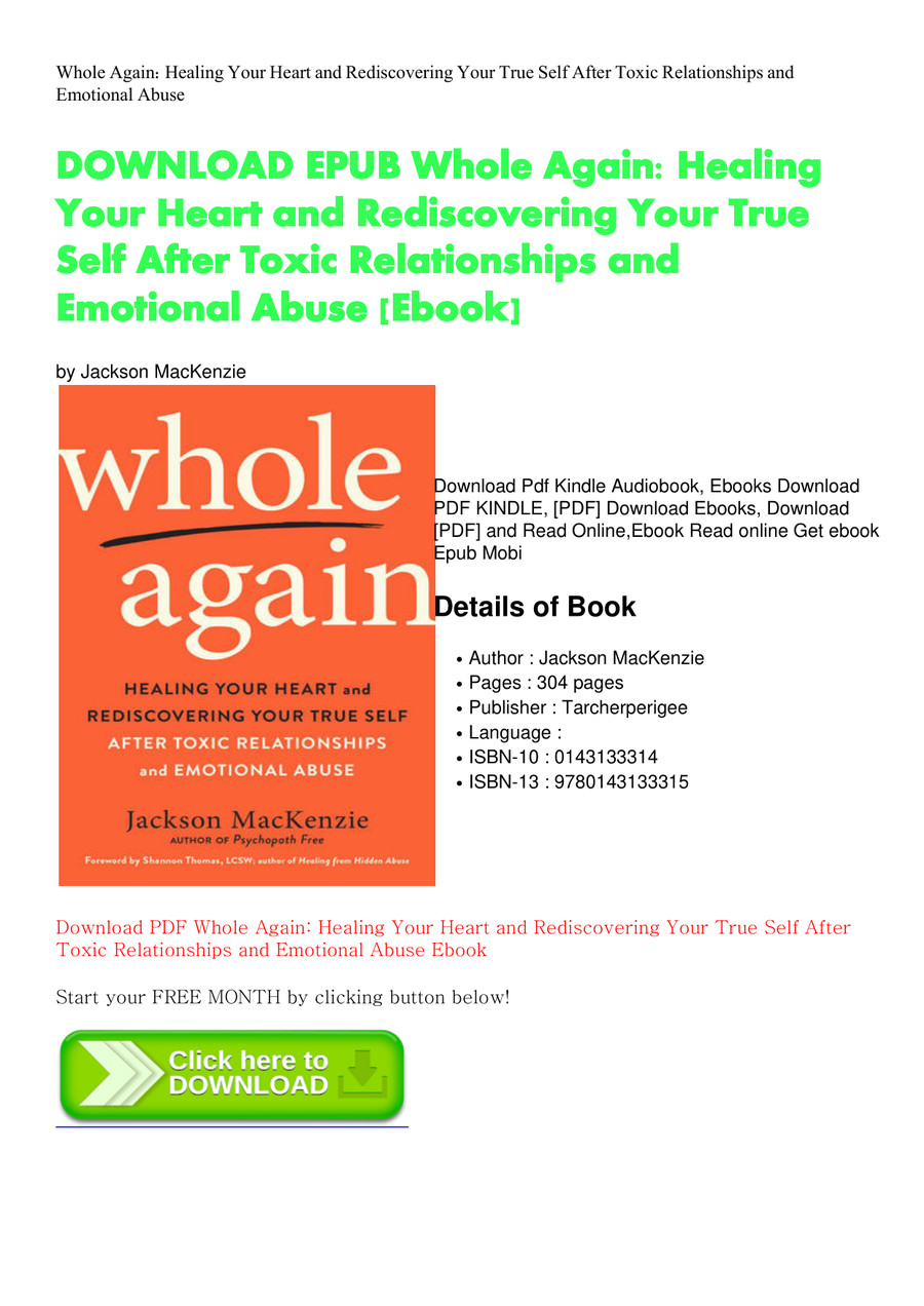 . Whole Again is a compassionate guide. Read Whole Again Healing Your Heart and Rediscovering Your True Self After Toxic Relationships and Emotional Abuse by Jackson MacKenzie available from Rakuten Kobo. Jackson MacKenzie has helped millions of people in their struggle to understand the experience of toxic relationships.